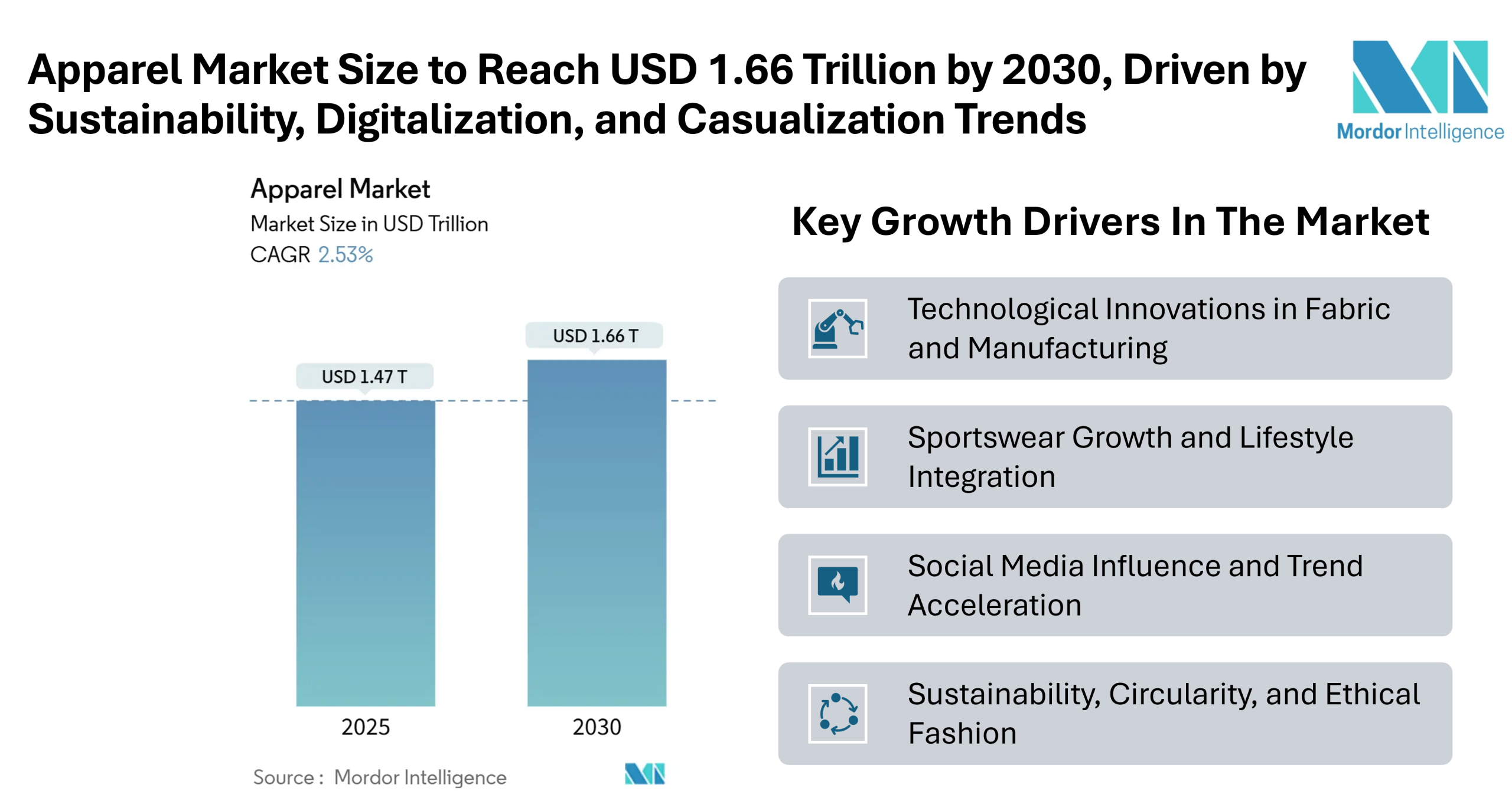 According to Mordor Intelligence, the global apparel market size is poised to expand from USD 1.47 trillion in 2025 to USD 1.66 trillion by 2030, registering a CAGR of 2.53%. Despite economic uncertainty and inflation in advanced markets, factors such as rising discretionary spending, digital transformation, and demand for sustainable, comfort-first apparel continue to shape the industry.