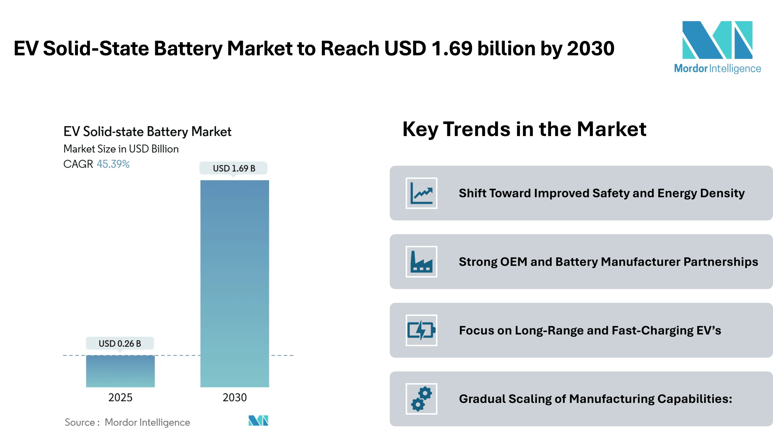 The EV solid-state battery market currently stands at USD 0.26 billion in 2025, and it is forecast to expand to USD 1.69 billion by 2030 at a 45.39% CAGR, supported by rising electric vehicle adoption and long-term investments in next-generation battery systems. Solid-state batteries replace liquid electrolytes with solid materials, helping address concerns related to thermal stability, charging efficiency, and vehicle range.