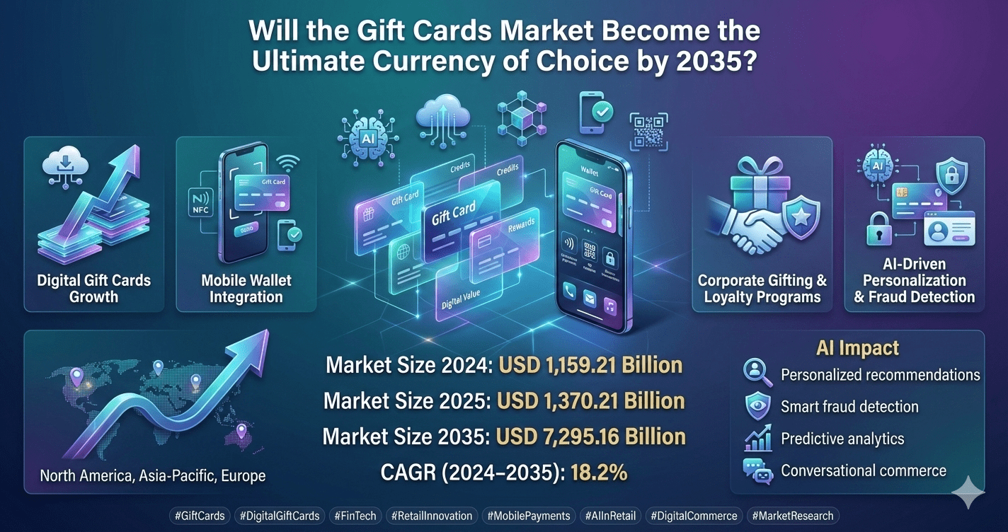 The Gift Cards Market is experiencing unprecedented expansion, reflecting a fundamental shift in consumer spending behavior and digital payment preferences worldwide. Valued at USD 1159.21 billion in 2024, the market has surged to USD 1370.21 billion in 2025, demonstrating robust momentum in just one year. Industry projections indicate this dynamic sector will reach an impressive USD 7295.16 billion by 2035, advancing at a compound annual growth rate of 18.2% throughout the forecast period from 2025 to 2035. This extraordinary growth trajectory positions gift cards as one of the most rapidly evolving segments within the global payments and retail ecosystem.