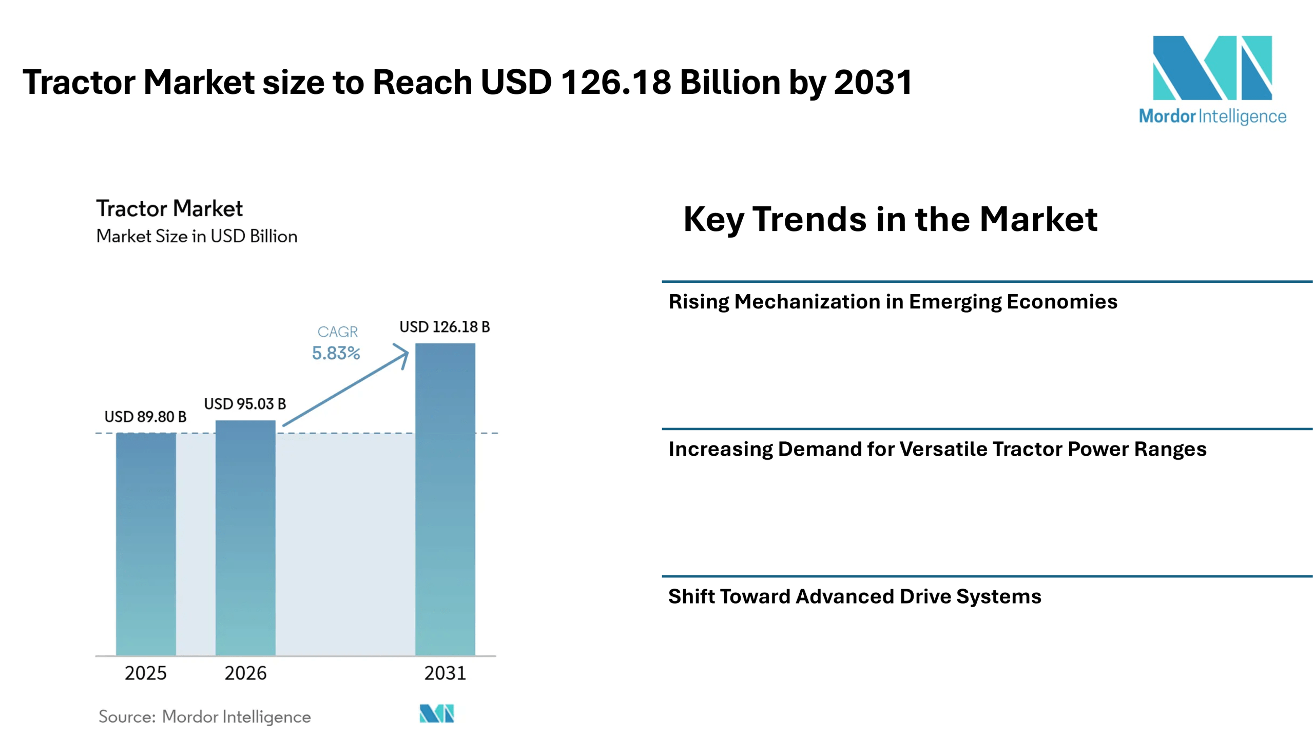According to Mordor Intelligence, the tractor market size is estimated at USD 95.03 billion in 2026, increasing from USD 89.8 billion in 2025, and is projected to reach USD 126.18 billion by 2031, registering a CAGR of 5.83% during the forecast period.